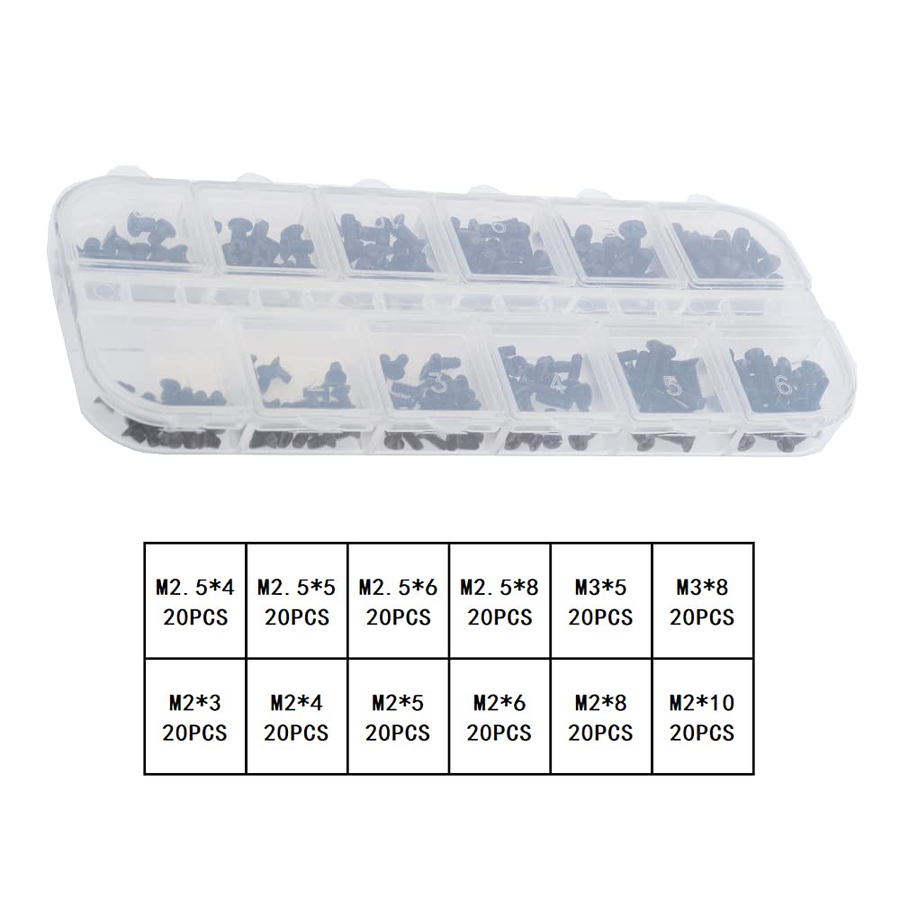 Includes: 20 pieces each of M2 x 3, M2 x 4, M2 x 5, M2 x 6, M2 x 8, M2 x 10, M2.5 x 4, M2.5 x 5, M2.5 x 6, M2.5 x 8, M3 x 5, and M3 x 8