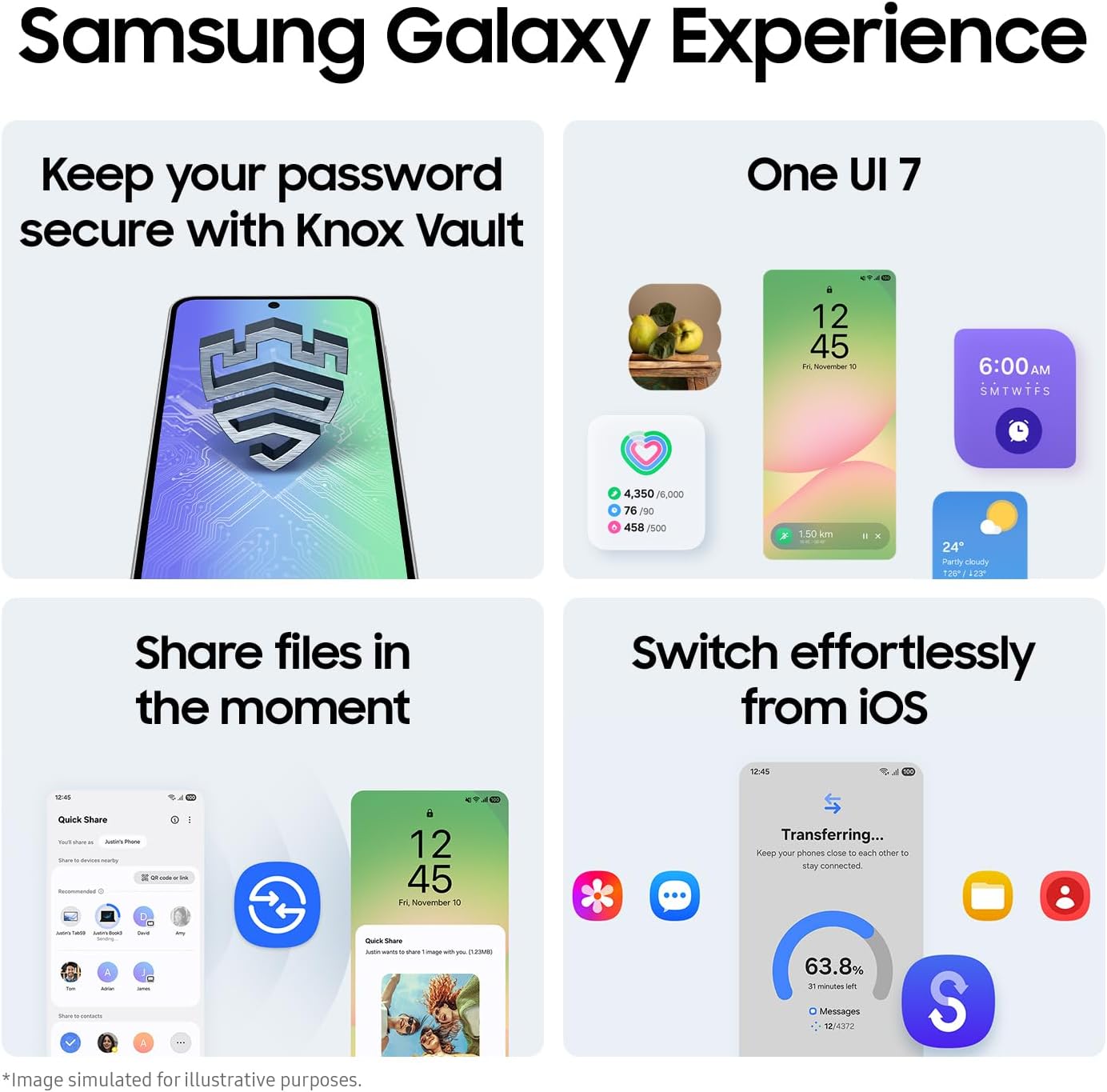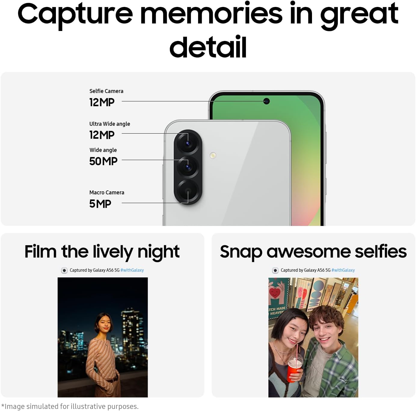 Long-Lasting Battery: Whether it’s family moments or important calls, stay powered without the wait with Galaxy A56 5G. Plus, Super Fast Charging ensures you’re back up and running as quickly as possible, so you can stay connected without being tied to an outlet.