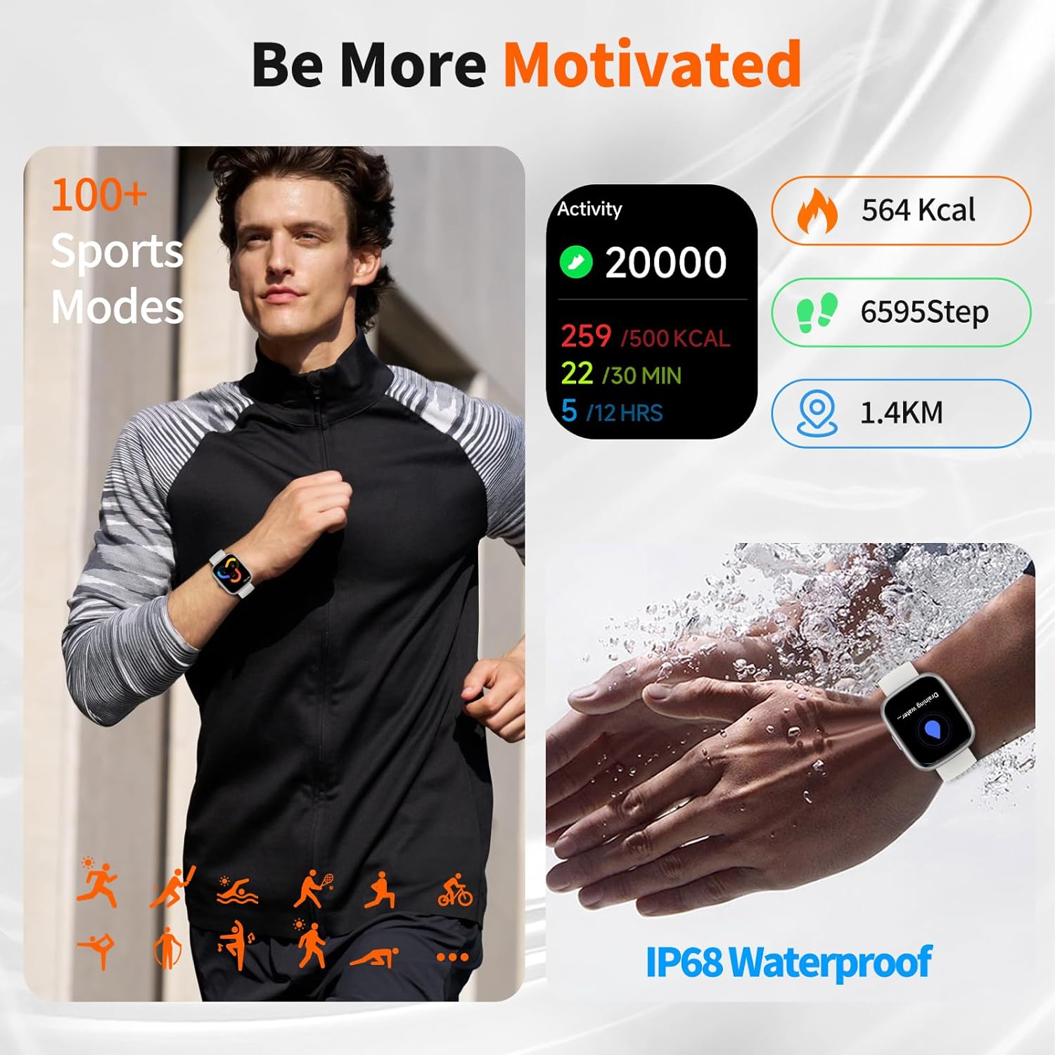 【100+ Sports Modes & IP68 Waterproof】 Whether it’s running, yoga, cycling, or swimming, choose from 100+ sport modes to monitor your workouts with real-time data. With an IP68 waterproof rating, the watch easily withstands sweat, rain, and splashes—ready for every fitness challenge.