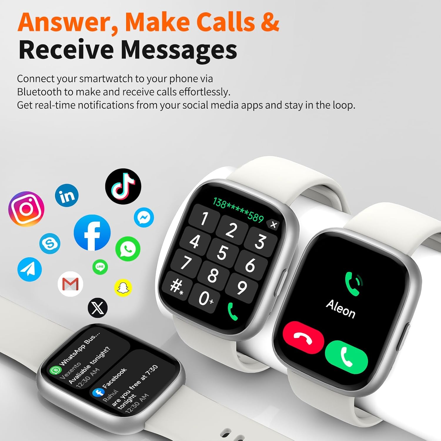 【Bluetooth 5.3 Calling & Smart Notifications】 Answer or make calls directly from your wrist with stable Bluetooth 5.3 connectivity. The built-in microphone and speaker deliver clear, hands-free audio. Stay connected with instant notifications from WhatsApp, X (Twitter), Facebook, Instagram, and more—so you never miss an important message, even when your phone isn’t nearby.