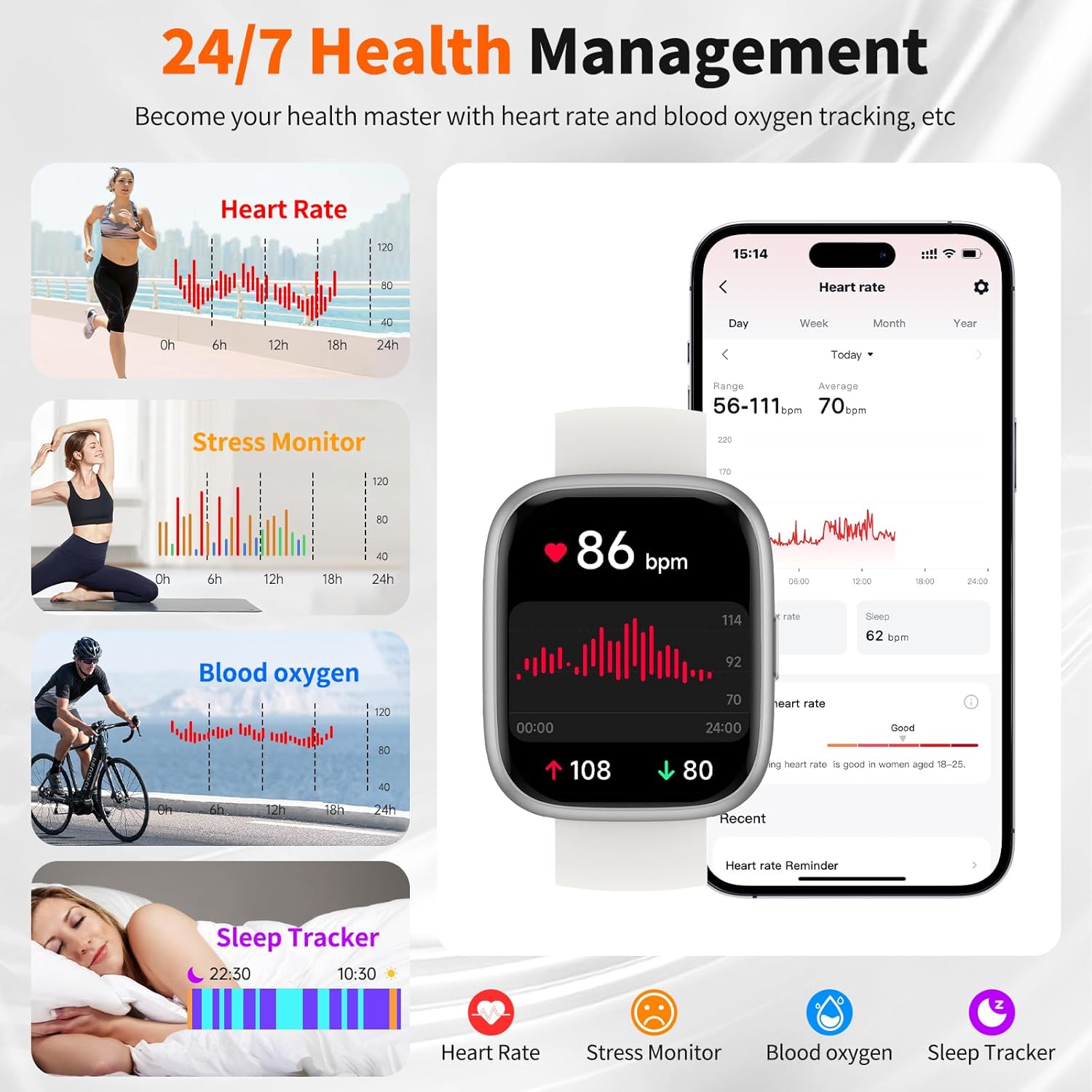 【24/7 Health & Wellness Tracking】 Track your heart rate, sleep patterns, stress levels, steps, and calories with precision sensors that deliver consistent accuracy. Get personalized insights in the “VeryFit” app to help you understand your health trends and build better daily habits.