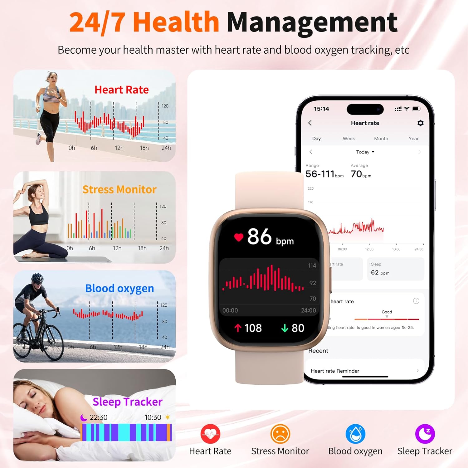 【24/7 Health & Wellness Tracking】 Track your heart rate, sleep patterns, stress levels, steps, and calories with precision sensors that deliver consistent accuracy. Get personalized insights in the “VeryFit” app to help you understand your health trends and build better daily habits.