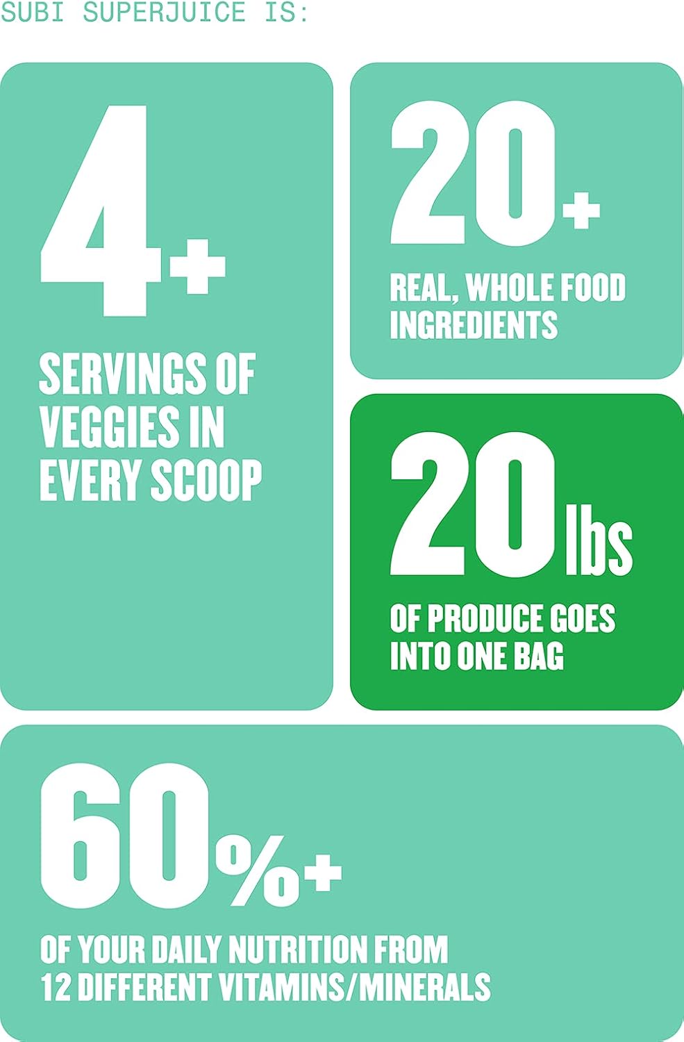 Subi is a powdered blend of freeze dried fruits, vegetables, and superfoods made from 23 amazing organic ingredients. Thanks to nutrient-dense superfoods and organic veggies, Subi has a diverse nutritional profile. Each 7 gram scoop of Subi contains 4 servings of vegetables and over 60% of your daily intake of 12 vitamins. Add a scoop of Subi to your morning drink and you’ll feel the benefit of the planet’s cleanest, premium produce all day long! Subi is the easiest way to guarantee you get the nutrition you need to power through whatever you want to do.