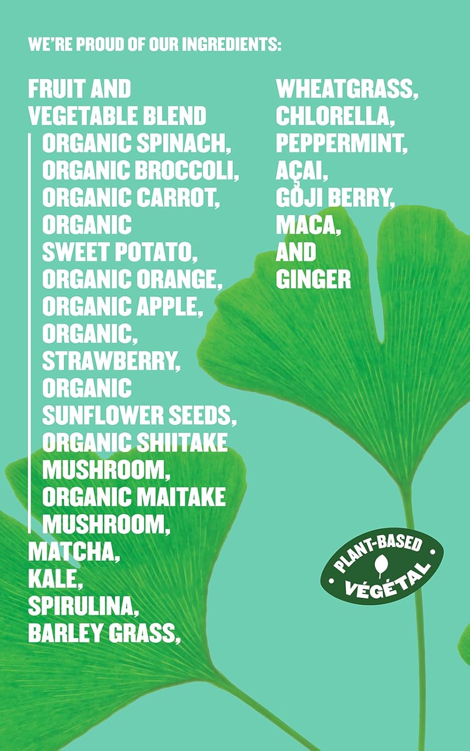 Organic Superfood Blend: Made with nutrient-packed organic whole foods, including raw greens like spirulina, barley grass, chlorella, kale, spinach,sweet potato, mushrooms, broccoli, and fruits like acai and apple