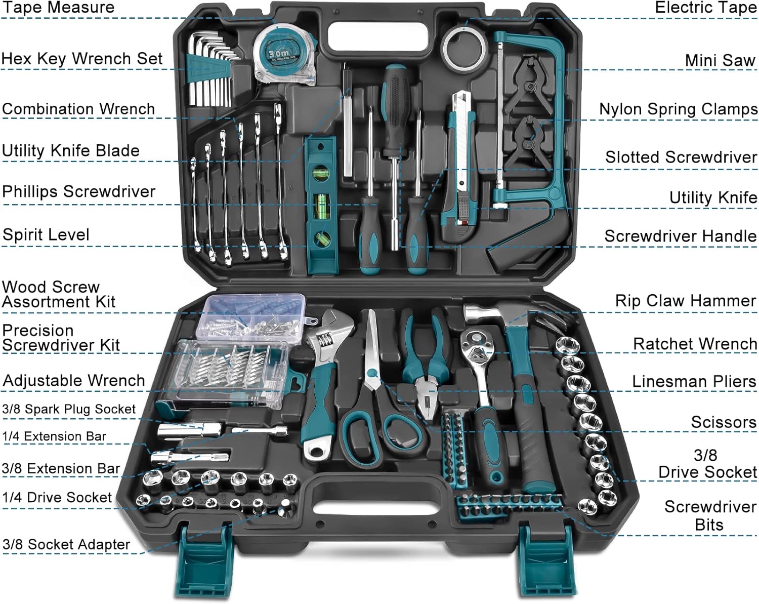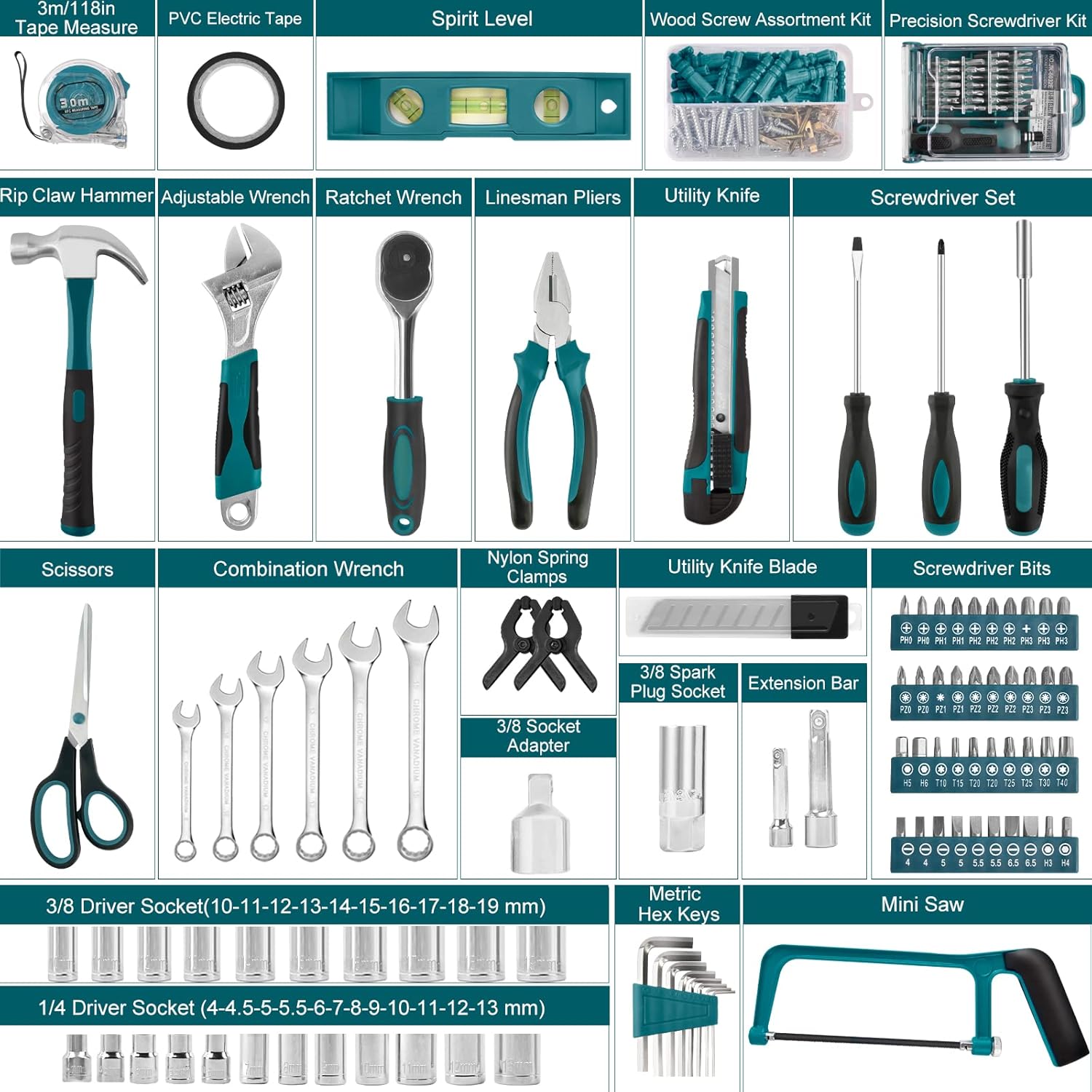 Application Scope: The repair tool kit is a good choice for family, friends and partners. The tools in the tools kit mainly include: Wrench Set, Metric Socket Set, Screwdriver Set, Screw kit, Pliers, Centimeters and Inches Measuring Tape, etc. Perfect for Homeowners, DIY, Repairers, Mechanics, Auto Repairers, etc