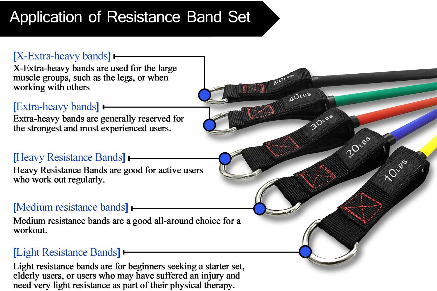 Versatility, make fitness simple: While free weights(barbells, dumbbells, kettlebells) have long been a fixture in gyms and weight machines are stable and easy to use, neither has the versatility of the resistance bands. 5 bands can be used alone or stacked in any combination of intensity from 10lbs to 150lbs. With attachable handles, ankle straps, door anchor, you can choose different training methods for building strength