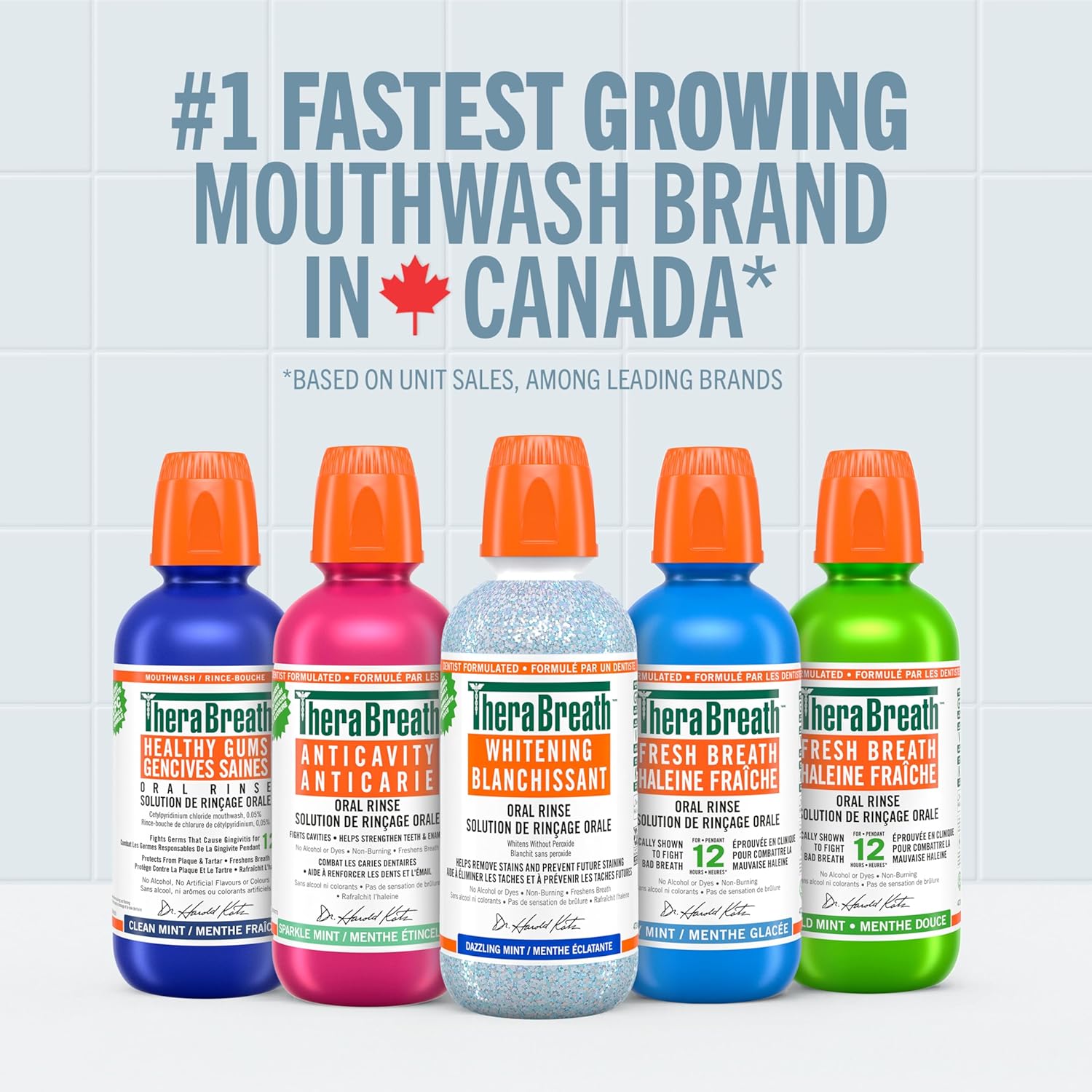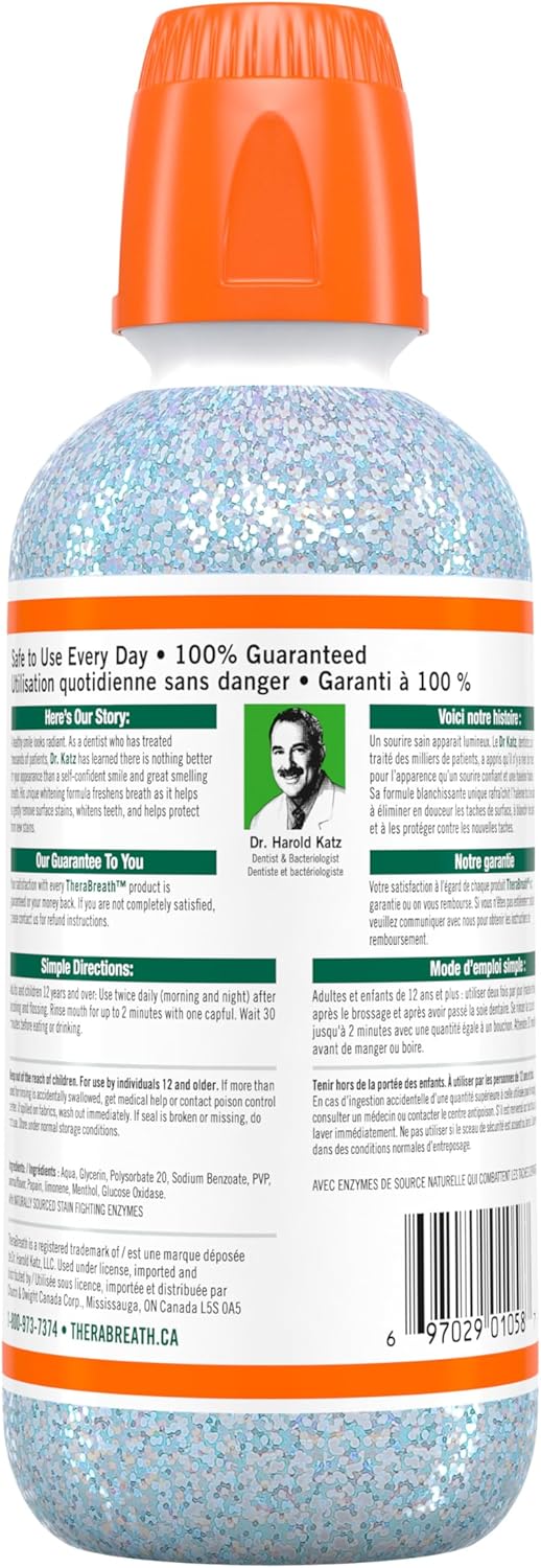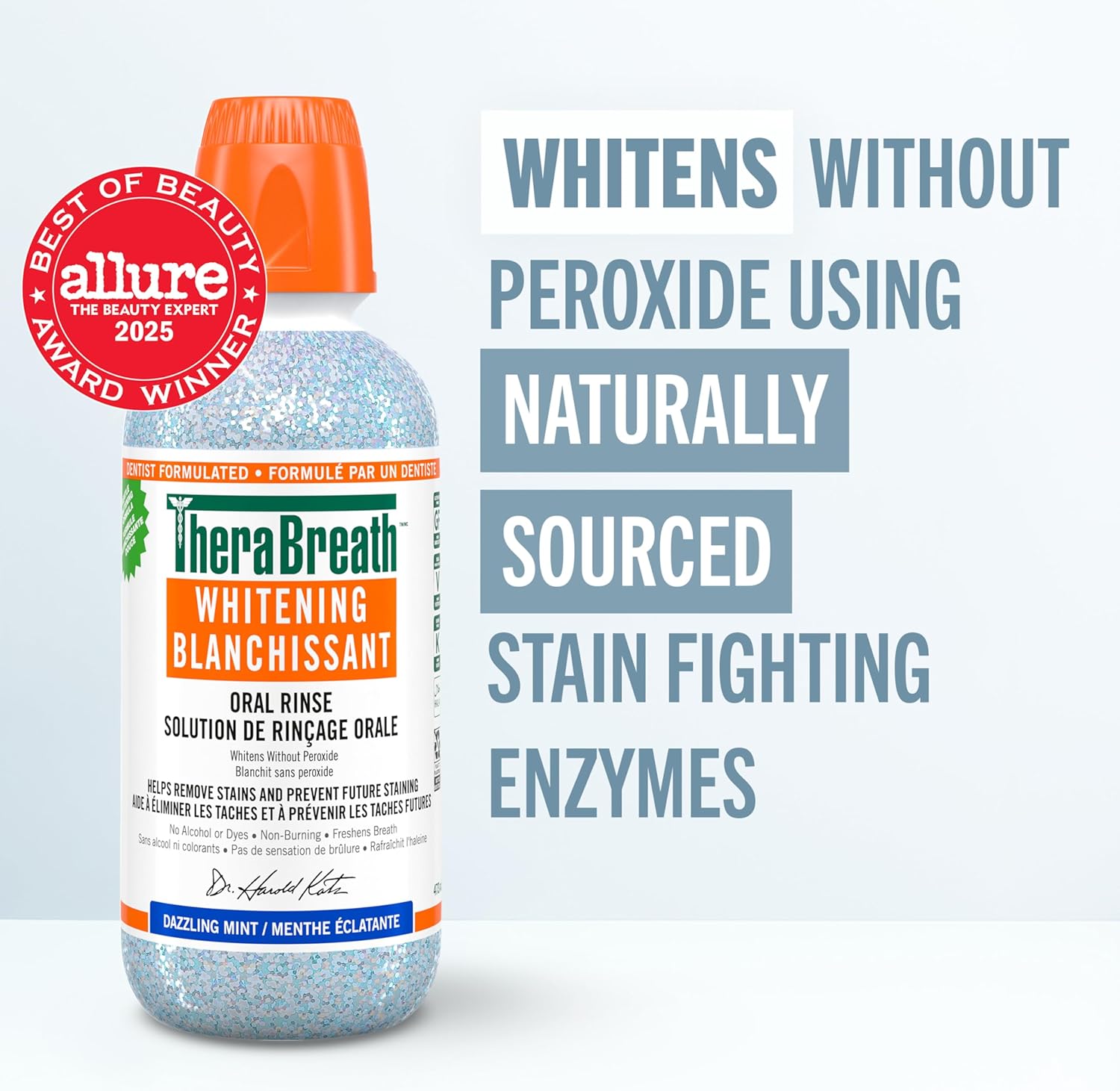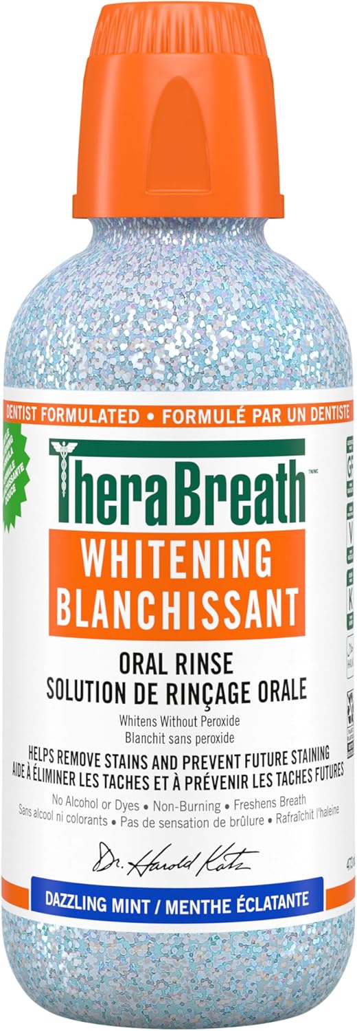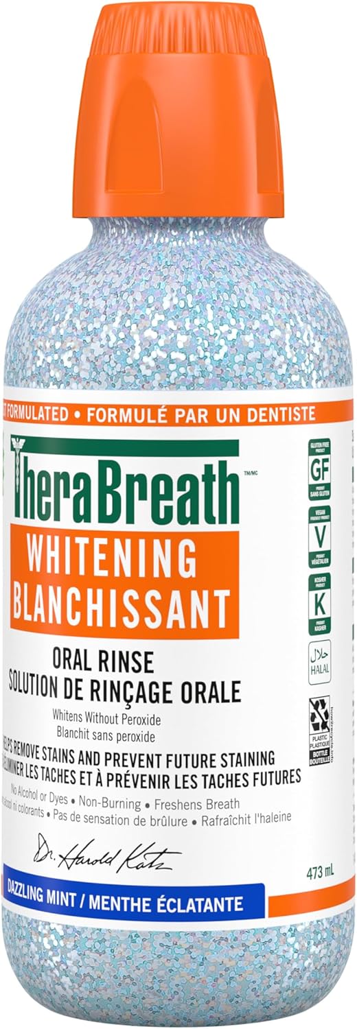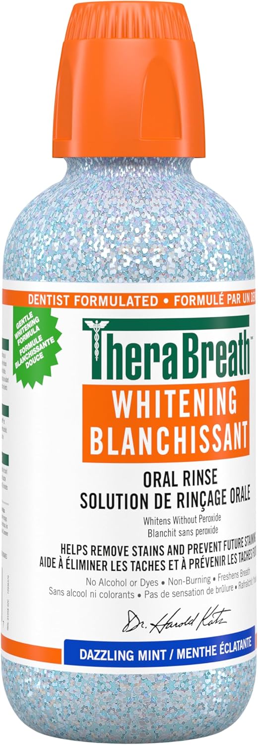 Brighten your smile with a daily whitening mouthwash designed for people who want real results without sensitivity. TheraBreath Whitening Mouthwash uses a peroxide-free, dentist-developed formula powered by professional-grade stain-fighting enzymes to help remove surface stains and prevent new ones from forming. Engineered for everyday use, this gentle, alcohol-free rinse delivers effective whitening performance while keeping your mouth comfortable—no harsh burn, no irritation, no enamel damage. Perfect for Solution Seekers who want a noticeably brighter, cleaner smile, this whitening rinse fits seamlessly into your daily routine, helping enhance and maintain your whitening results over time. The clean Dazzling Mint flavour leaves your mouth feeling fresh and polished after every rinse, making it an easy step to stay consistent with. Trusted by dental professionals for decades, TheraBreath Whitening Mouthwash is made with high-quality, science-backed ingredients and is free of alcohol, peroxide, artificial flavours, dyes, parabens, and harsh additives that can cause sensitivity. It’s a safe, effective choice for anyone looking to elevate their oral care with gentle whitening you can rely on. Certified vegan, kosher, gluten-free, and halal.