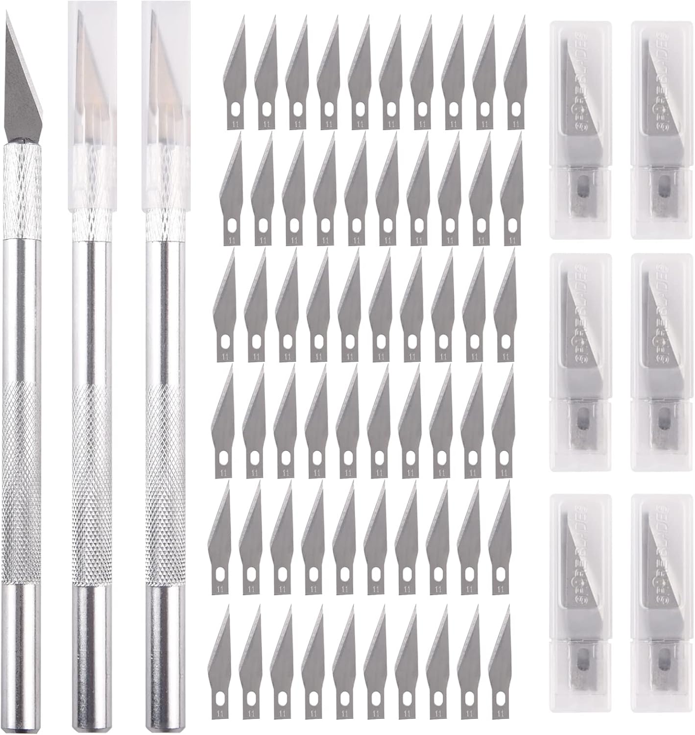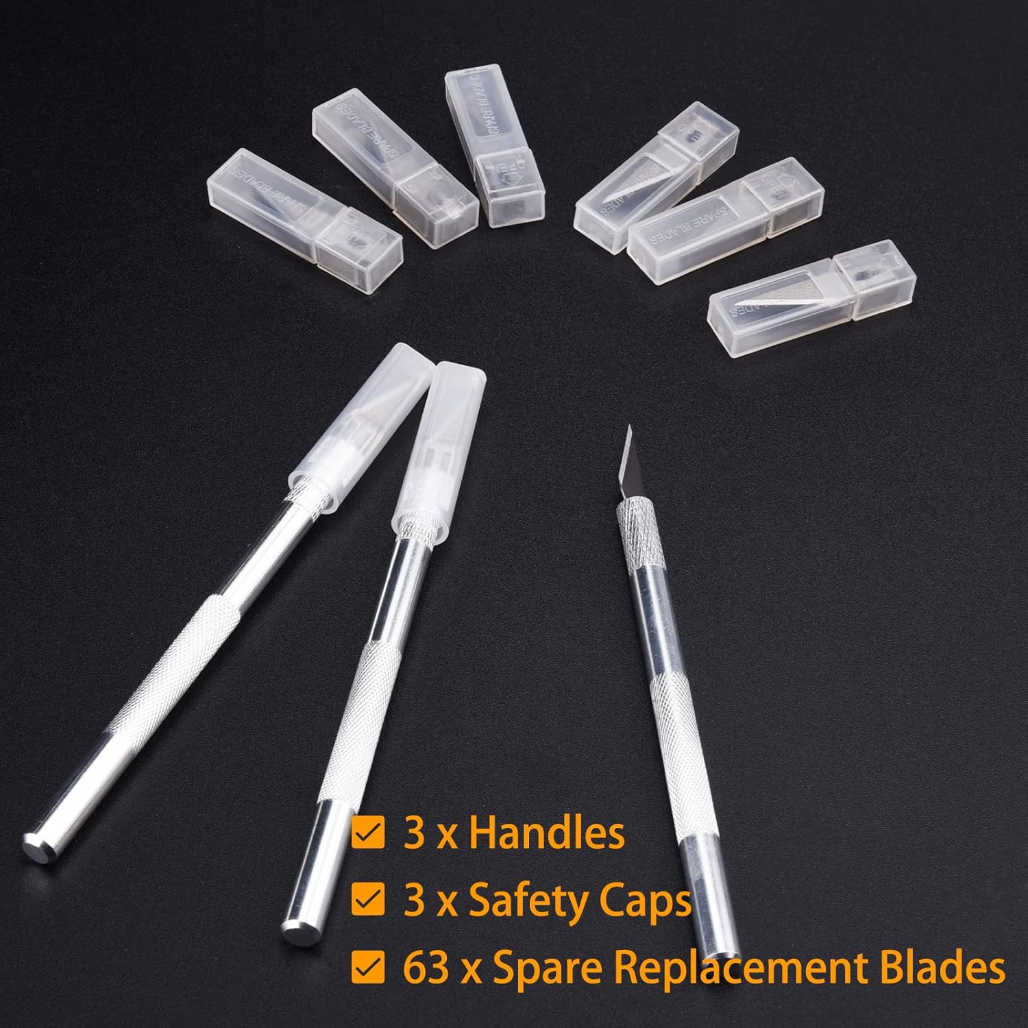 ✅【Great Value Pack】Include 3 handles and 63 spare replacement blades. Each hobby knife is equipped with a protective cap and each blade is packed in a hardshell case. Ensure Safety.