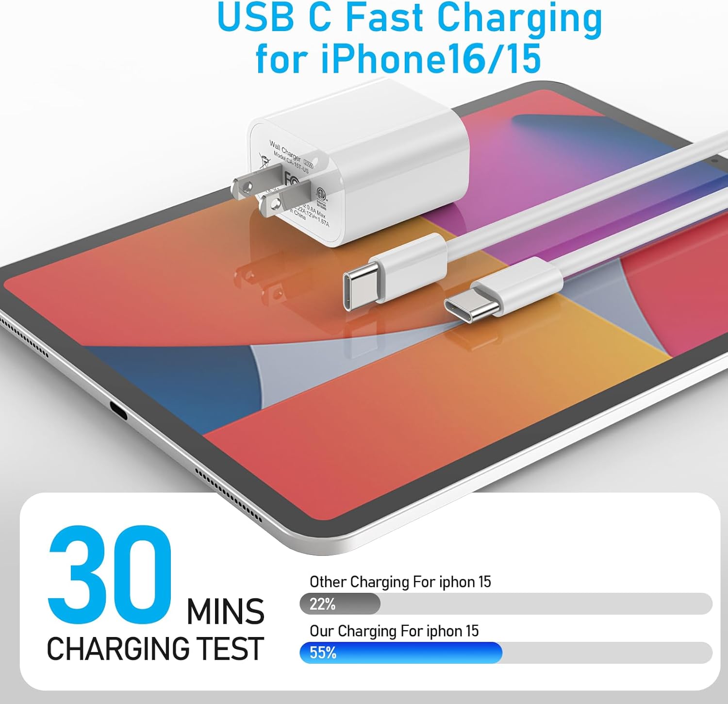 【Fast Charging for iPhone 17/16/15】20W PD USB C Charger with 6ft type c fast charging cord is designed to provide fast charging for your devices, USB-C port provides Max 20W output power, 3X faster than standard USB charger.charging your iPhone 17/16/15 Pro Max up to 50% in just 30 minutes, full charger iPad Pro 12.9 in 2.5 hours
