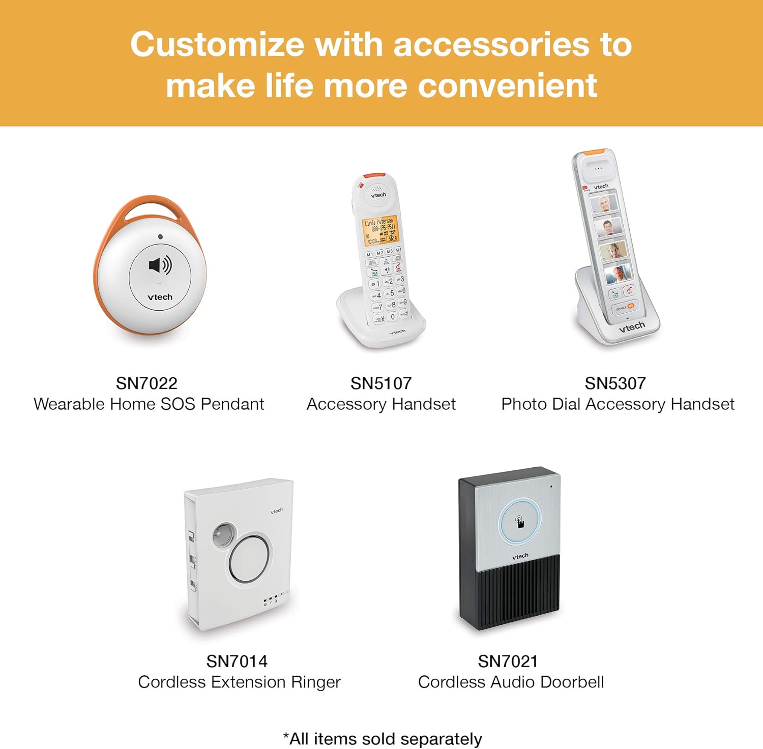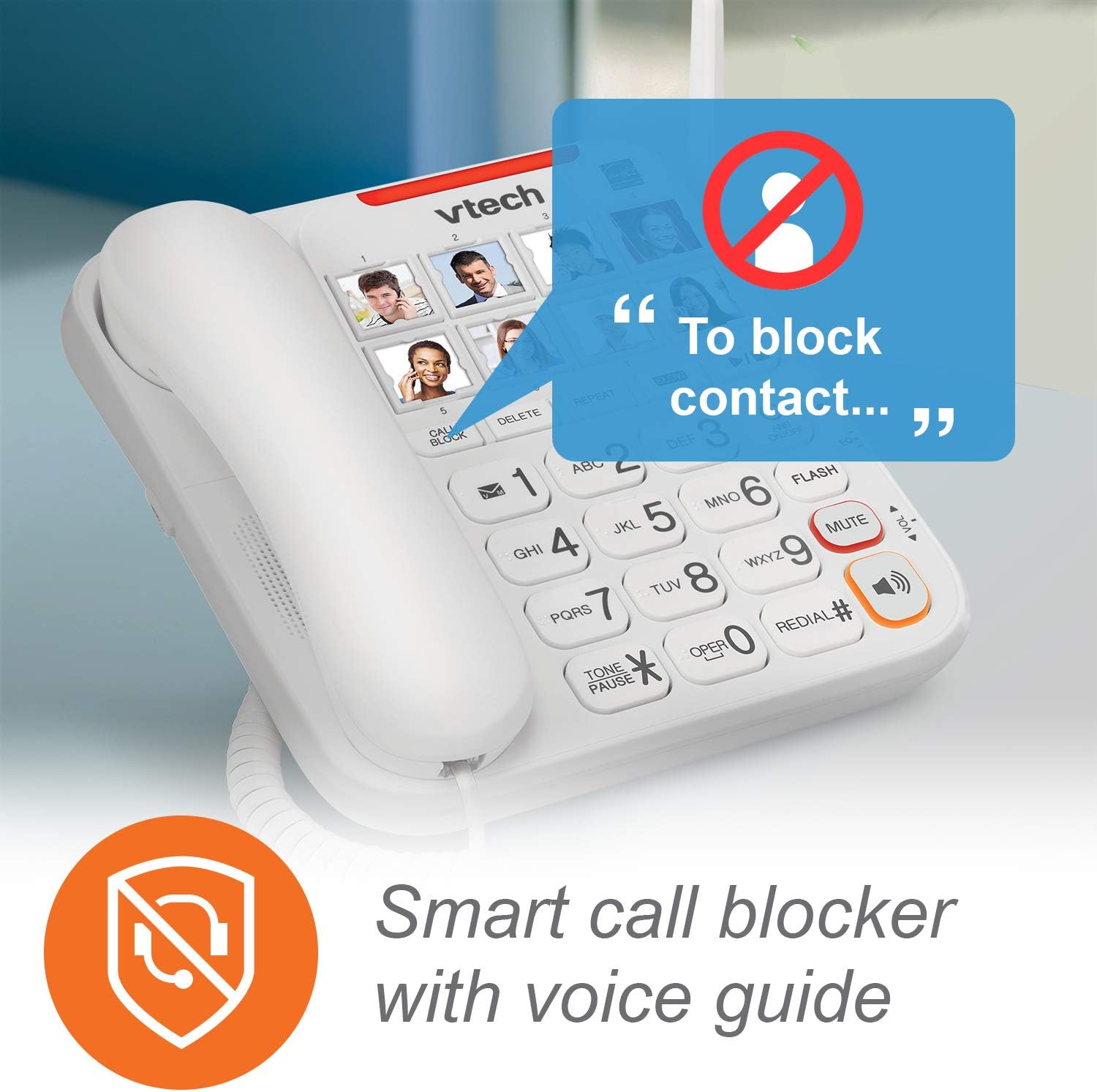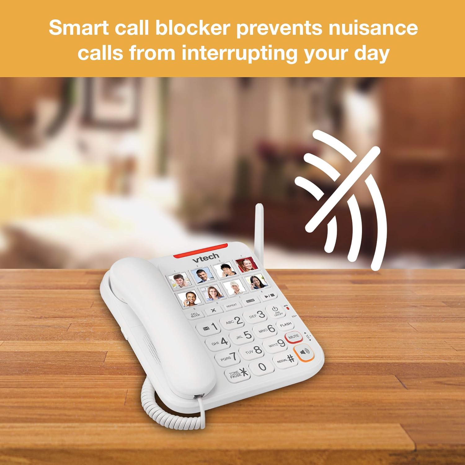 Designed for seniors or the hearing impaired, the VTech CareLine SN5147 Amplified Corded/ Cordless Senior Phone System with 90dB Extra-Loud Visual Ringer, Big Buttons & Large Display comes with features to make hearing and dialing calls easier than ever. With big buttons, large displays, and a full-duplex speakerphone on each device, this senior-friendly telephone system takes the guesswork out of dialing calls. Attach a photo to each of the four photo speed dial buttons on the Photo Dial handset and call frequently dialed phone numbers with one touch for quick access to friends and family. Increase the volume of incoming sound on this VTech CareLine SN5147 Amplified Corded/ Cordless Senior Phone System with 90dB Extra-Loud Visual Ringer, Big Buttons & Large Display by up to 50 decibels, making conversations easier to hear and understand. You can say goodbye to unwanted calls with this amplified telephone thanks to smart call blocker. Robocalls on your landline are automatically blocked from ever ringing through—even the first time. You can also permanently blacklist up to 1,000 numbers with one touch.