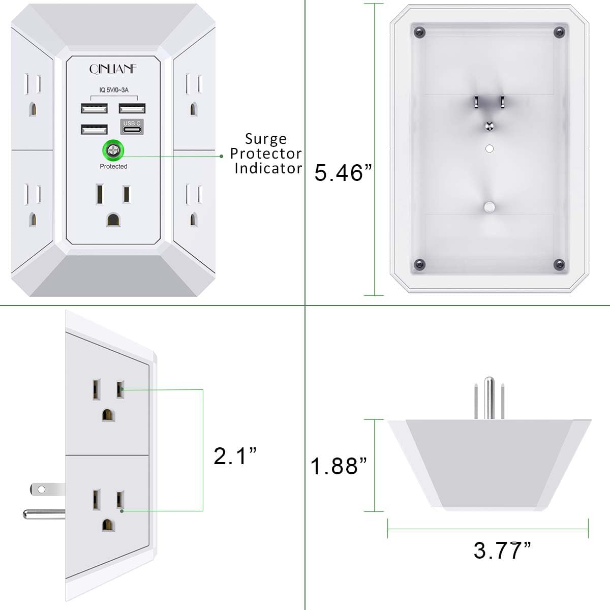 QINLIANF Surge Protector With 5 Outlet Extender & 4 USB Charging Ports