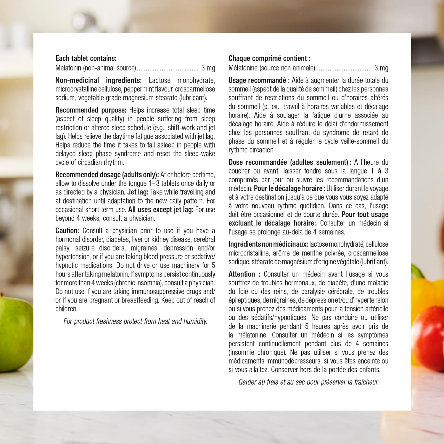 Each Sublingual Tablet Provides: 3 mg of Melatonin, peppermint flavoured. They are easily dissolved under the tongue with no water needed. Sublingual, or under the tongue, absorption enters the bloodstream quicker than traditional tablets or capsules