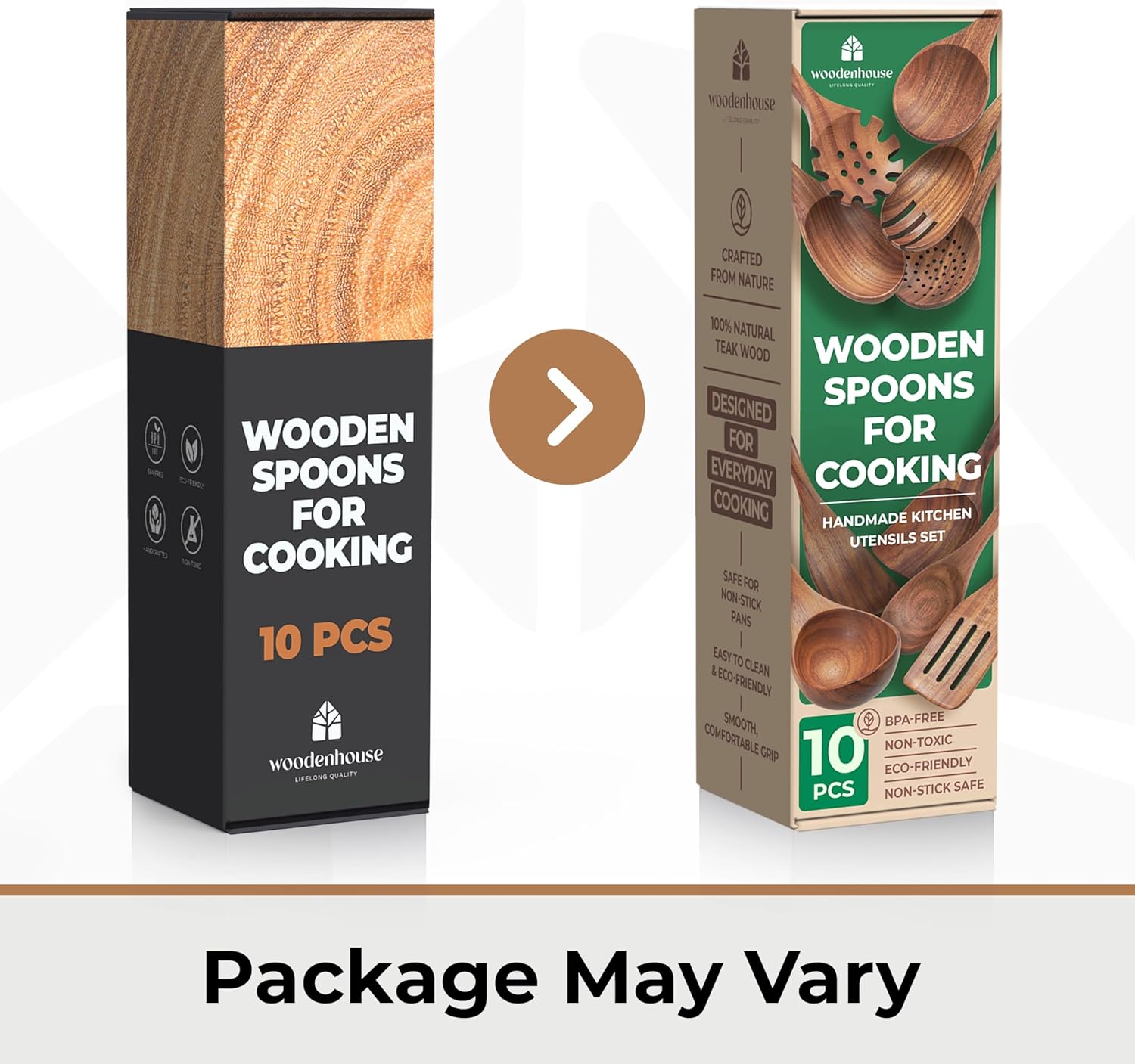 100% NATURAL TEAK WOOD : Woodenhouse kitchen utensils will last a lifetime, they are made of one piece 100% Natural Teak Wood. These tools are beautiful, solid, sturdy, smooth, well designed and have a superb finish. This set will not crack, melt or smell. Utensils may vary in shade because of its natural material.