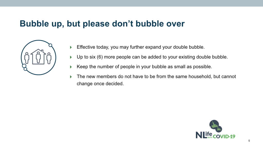 More guidance can be found online here: https://www.gov.nl.ca/covid-19/individuals-and-households/expansion-of-household-bubble/