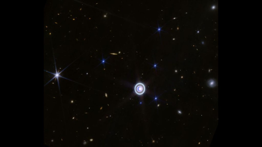 It’s a much more detailed view of Uranus than humankind’s first close-up of the seventh planet, taken by NASA’s Voyager 2 probe in 1986. That featureless image showed a solid bluish orb with no detail. JWST, by contrast, has captured atmospheric features such as a north polar cloud cap. That growing and receding cap is fascinating to planetary scientists because it’s visible evidence that Uranus spins on an axis tilted by 98 degrees, producing seasonal and meteorological effects that create storms.