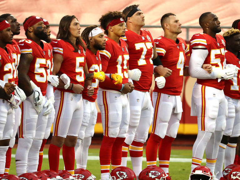 The Kansas City Chiefs stood on the field with their arms linked together for the Black national anthem. They also observed the U.S. national anthem, with some players standing arms linked, some facing the flag, and defensive end Alex Okafor kneeling.