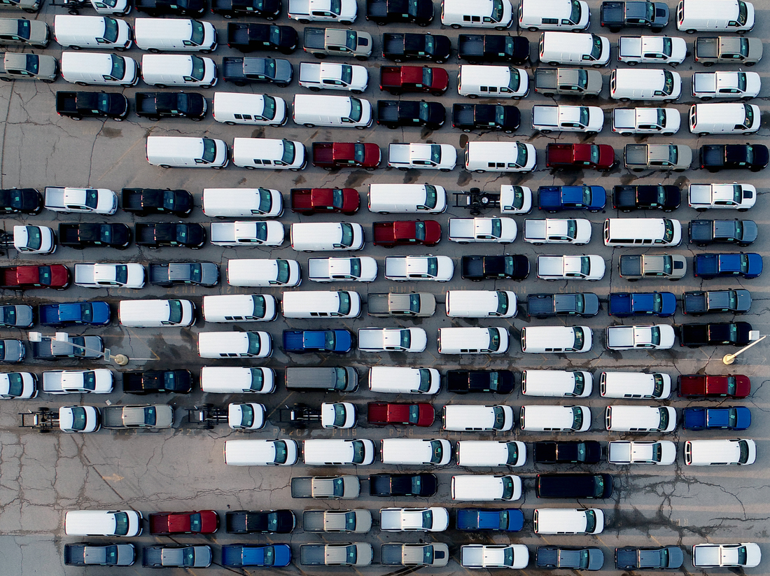 Pickup trucks and vans are seen in a parking lot outside a General Motors assembly plant on March 24 in Wentzville, Mo. Chip shortages have forced automakers to temporarily halt production through this year.