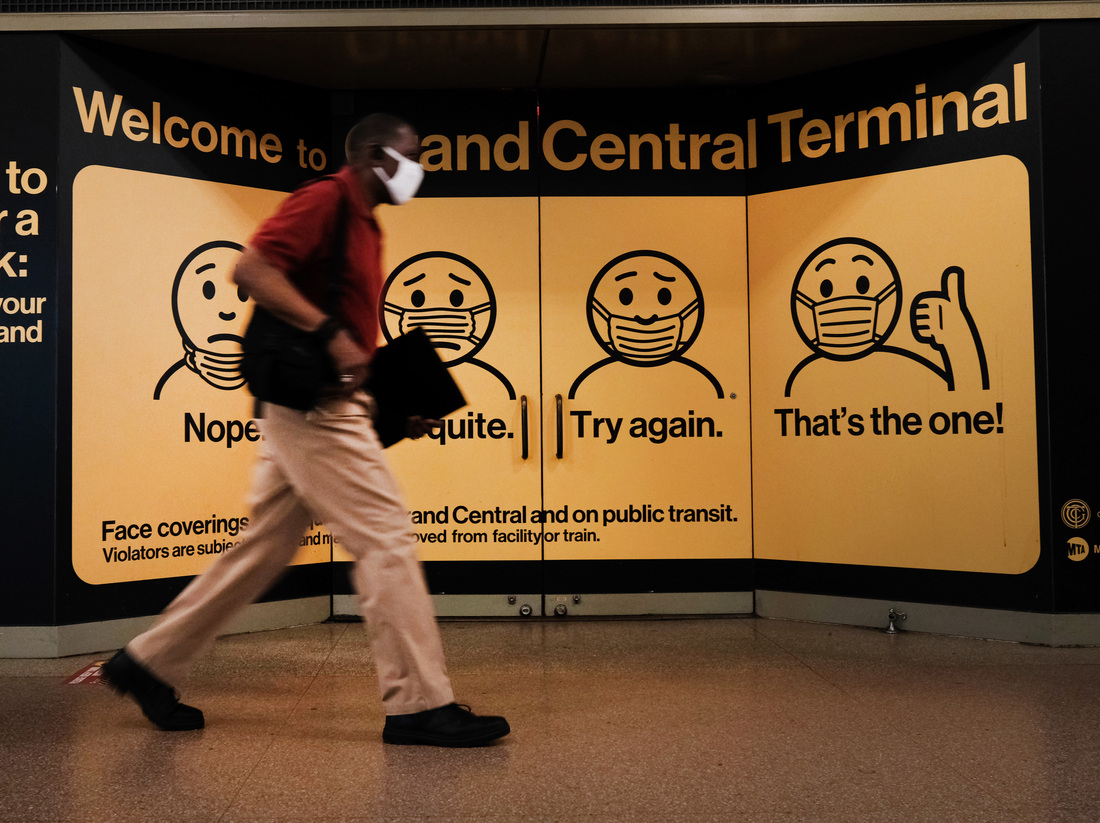 A person wears a mask while walking at Grand Central Terminal on July 27 in New York City. Masks continue to be required at many places despite the rollout of vaccines. The Centers for Disease Control and Prevention this week recommended that fully vaccinated people begin wearing masks indoors again in places with high coronavirus transmission rates.