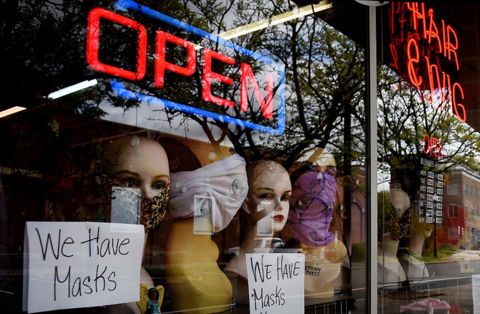 Mannequin heads wear masks in the window of a small boutique businesses to resume operations, … [+]