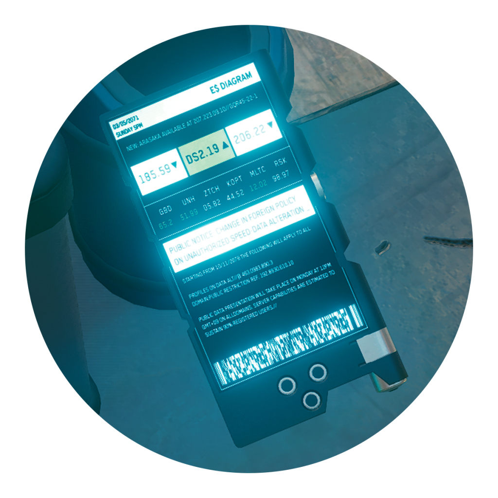 Yep, 2077 has tablets. Two of them, to be precise. The static screens in question weren’t at an adequate resolution for a bystander (yours truly) to sneak a peek. Either way, the bizarre diagrams and complicated graphs are well beyond my understanding. Placing vents on the left of these devices is a strange hardware decision because some of 2020’s best laptops are already fanless. The ARM chip-toting Macbook Air delivers excellent results without the help of a fan. The port at the bottom isn’t a foreign sight, especially if you consider the tablets of old that weren’t trying to be laptop replacements. But what really got my mind thinking was the little gizmo people were using in tandem with their tablets.