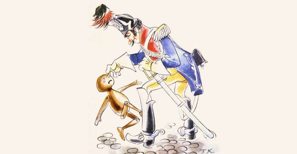 The Adventures of Pinocchio, which combined both novels, was published as a book in February 1883, with minor changes. Different in tone and plot, Pinocchio’s two parts share the same themes. Poverty dominates throughout the story and is often the subject of bitter humor. “What’s your father’s name?” a character asks Pinocchio. “Geppetto,” Pinocchio responds. “And what’s his job?” “Being poor.” “Does he make a lot of money doing it?” Haunted by a “hunger so real it could be cut with a knife,” Pinocchio is reduced at various points to eating fruit cores and performing strenuous labor for a meager glass of milk. Distrust of authority is central as well. Doctors are pompous incompetents. One is said to “solemnly” intone, “When the dead cry, it means they’re on the way to recovering.” The police? Always blaming the victim. The judiciary? Literally apes. At one point, Pinocchio gets thrown behind bars for getting robbed—“This poor devil has been robbed of four gold coins. Therefore seize him and put him straight in jail”—and needs to convince the guards that he is not an innocent victim (“but I’m a crook too”) in order to be set free.