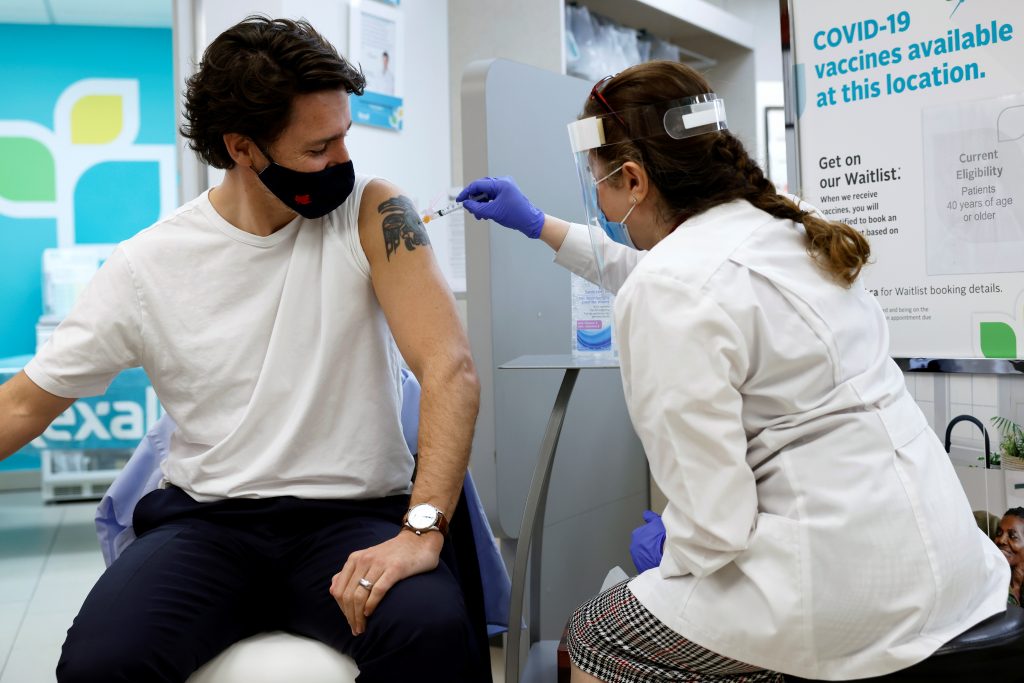 OTTAWA (Reuters) – Prime Minister Justin Trudeau on Friday received his first dose of AstraZeneca’s COVID-19 vaccine at an Ottawa pharmacy, telling reporters “I’m very excited” as the needle entered his arm.