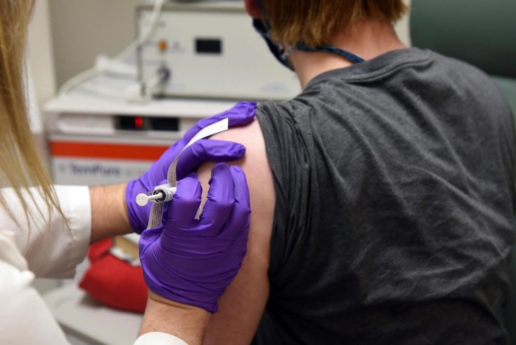 FILE – In this May 4, 2020 photo provided by the University of Maryland School of Medicine, the first patient enrolled in Pfizer’s COVID-19 coronavirus vaccine clinical trial at the University of Maryland School of Medicine in Baltimore, receives an injection. The first of four experimental COVID-19 vaccines being tested by Pfizer and its German partner BioNTech showed encouraging results in very early testing of 45 people, the companies said Wednesday, July 1, 2020. (University of Maryland School of Medicine via AP)