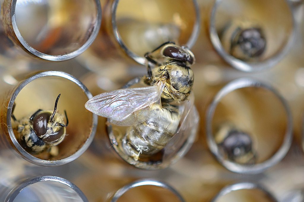 Did you know that worker honeybees are the only bees used in agrochemical risk assessment? Although the queen and drones are in charge of reproduction within the hives, only the workers are subjected to the toxicological risk assessment. An excellent in vitro toxicological exposure for workers is currently available for researchers. Over the past few decades, many studies that attempted to raise male honeybees in vitro have failed; however, a successful in vitro protocol for rearing male honeybees for future agrochemical risk assessment was developed in our lab in 2023. This stunning image shows the first curious male honeybee emerging from the plate in the lab instead of its usual wax comb. So, what is the male honeybee looking for?