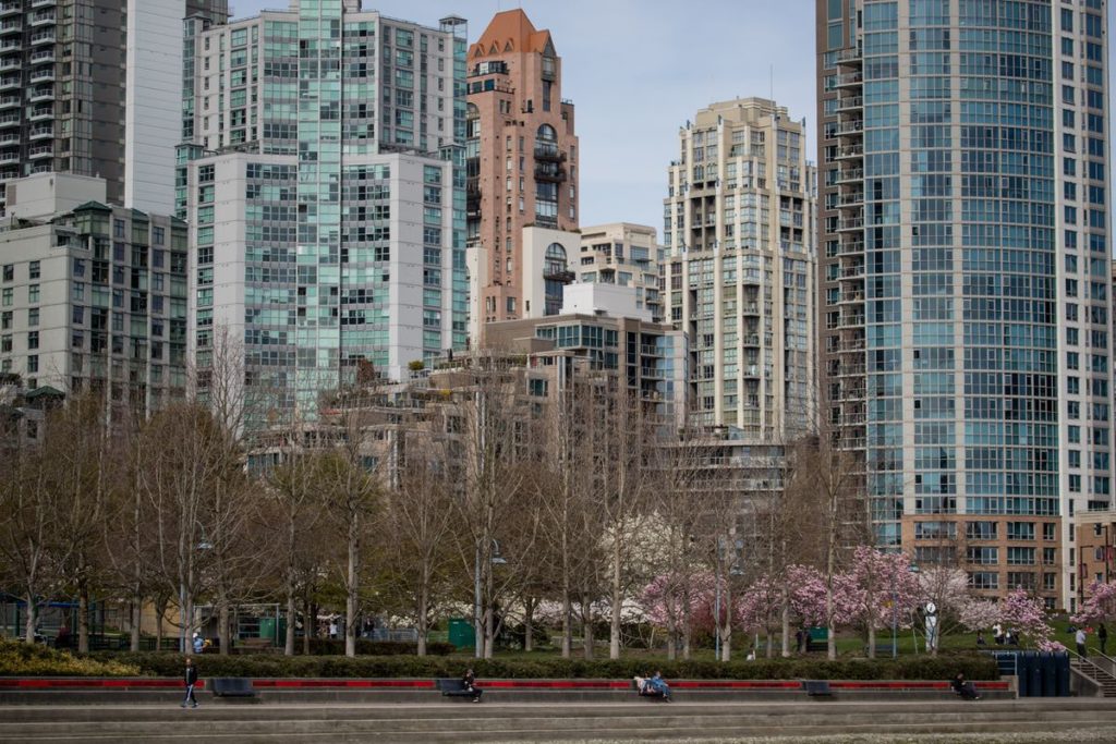 Condo towers in Yaletown are seen in the background as people walk and sit along the False Creek seawall in Vancouver.
