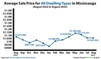 Graph showing average sale price for Mississauga detached homes between August 2022 and August 2023.