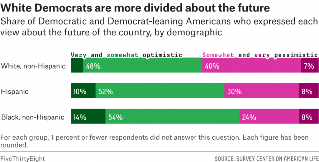 “>1 More than 6 in 10 Black Democrats (68 percent), and 62 percent of Hispanic Democrats said they were somewhat or very optimistic about the country’s future but white Democrats were much more divided — roughly as many said they felt optimistic (53 percent) as pessimistic (47 percent) about where the United States is headed.
