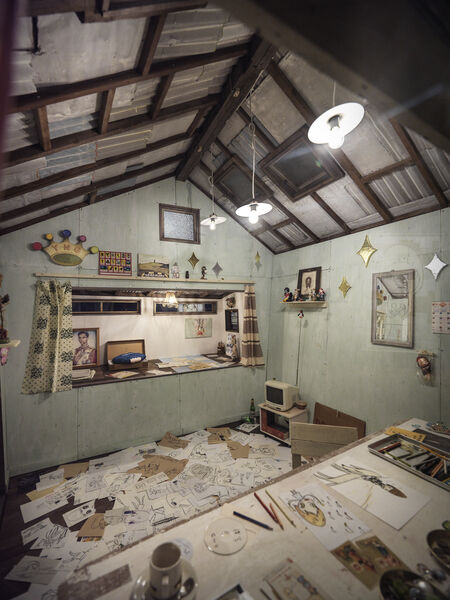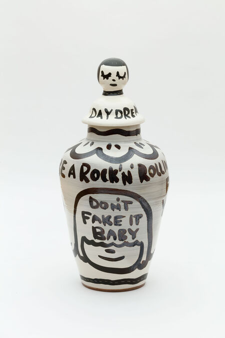 Perhaps that’s why Nara chose to visually distinguish his fourth, and final, act from the other areas of the exhibition. Painted a saturated dark blue, the room radiates a deep calm, presenting the installation My Drawing Room (2008), ceramics and some of Nara’s latest works on cardboard, including the large Girl with Drum sticks and Girl with Guitar (both 2019).